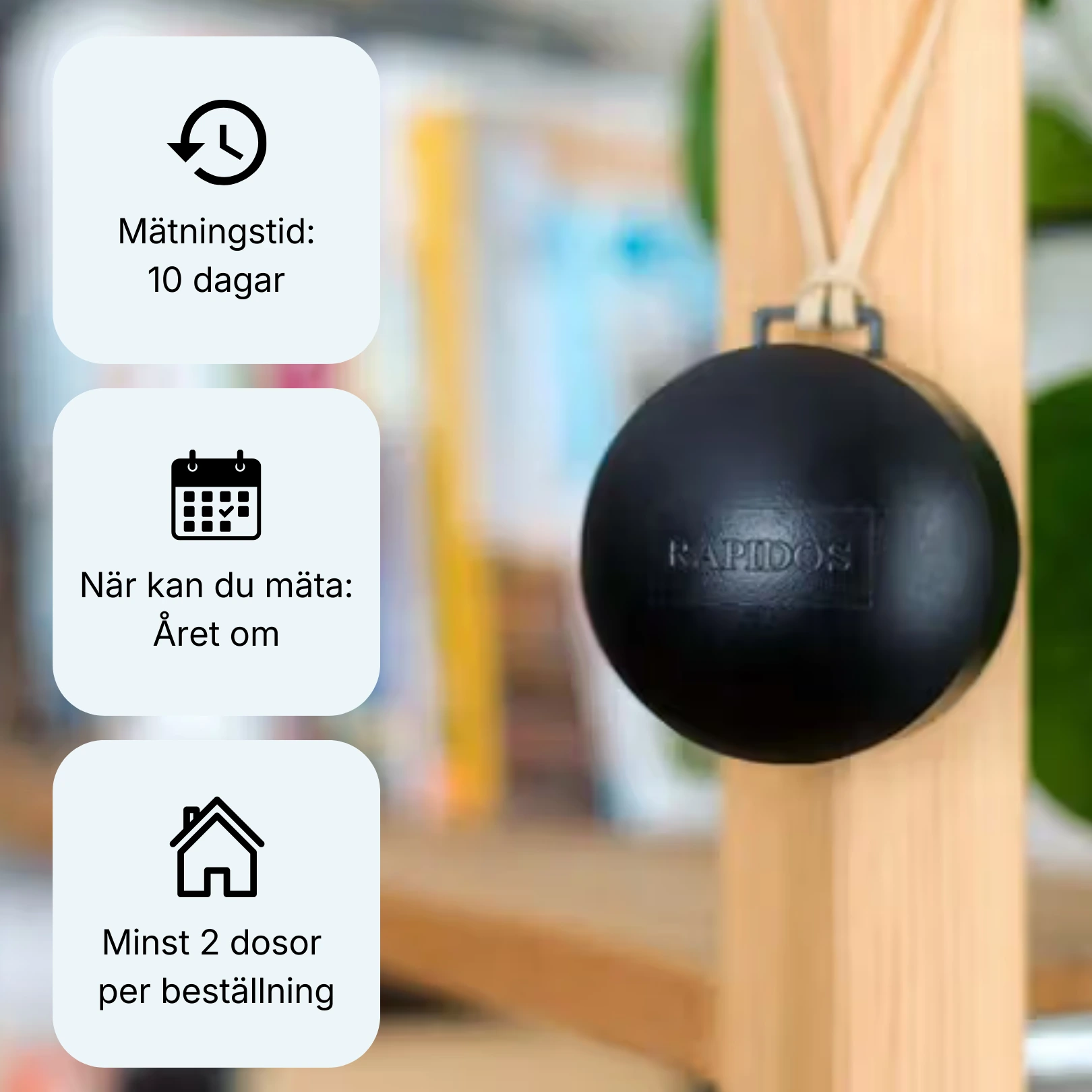 En korttidsmätning med Rapidos+ ger en snabb indikation på radonhalten i ditt hem. Används med fördel vid exempelvis köp/sälj av bostad.