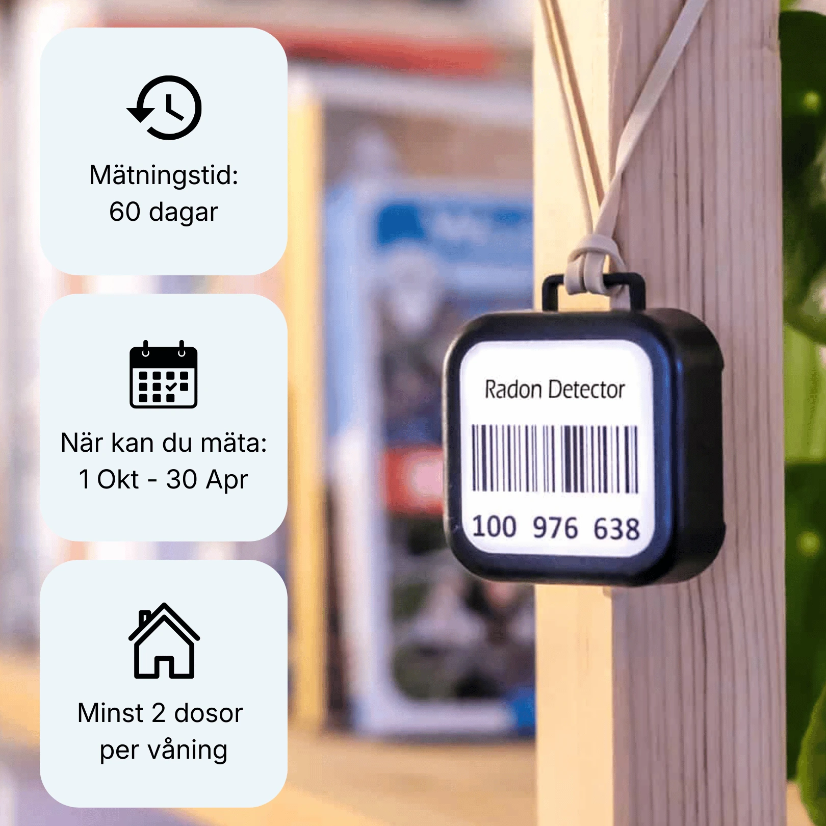 Du behöver två detektorer för 1-2 våningsplan, rekommendationen är sedan att ha en dosa per våningsplan i fastigheten, har du t.ex. tre våningar så rekommenderas tre dosor. I den mån det möjligt bör dosorna placeras i vistelserum (sovrum och vardagsrum) vid mätningen.